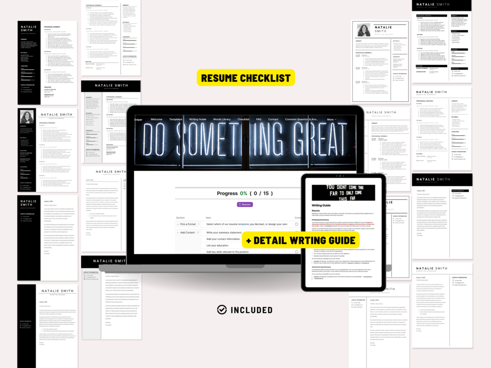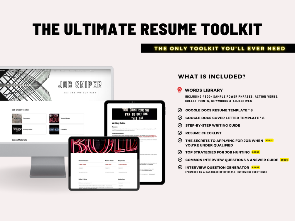 The Job Sniper Toolkit is your secret weapon for making an impressive resume. Our professionally designed templates, checklist and over 4800+ powerful phrases, words, and sample bullet points can save you hours of work and give you plenty of inspiration for writing a killer resume. Stand out from the competition and land the job you want with this complete toolkit!