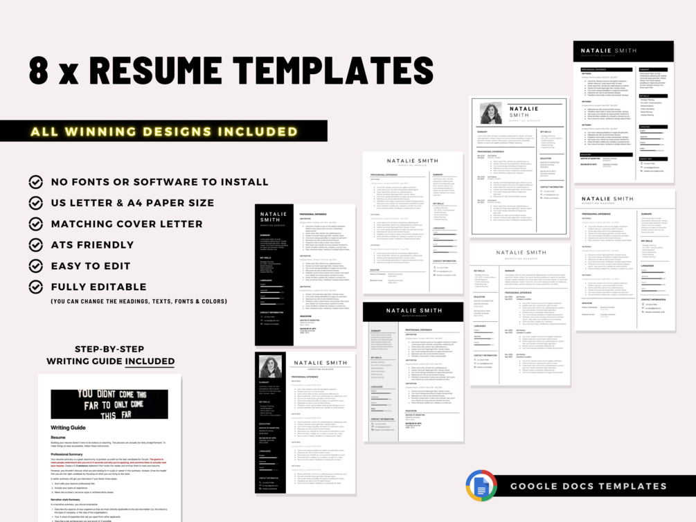 Access to the Words Library (including 4800+ sample power phrases / words), Google Docs Resume Template * 8, Google Docs Cover Letter Template * 8, Writing Guide, Resume Checklist, The Secrets to Apply For Job When You're Under Qualified (Guide), Top Strategies for Job Hunting (Guide), 50 Common Interview Questions & Answer Guide, Interview Question Generator (powered by a database of over 340+ interview questions)