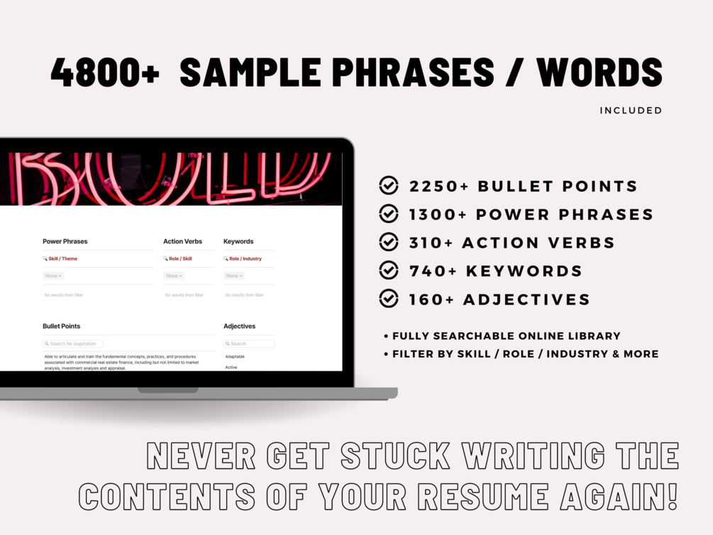 - Words Library of Over 4,800+ Sample Power Phrases, Action Verbs, Keywords, Adjectives And Bullet Points
